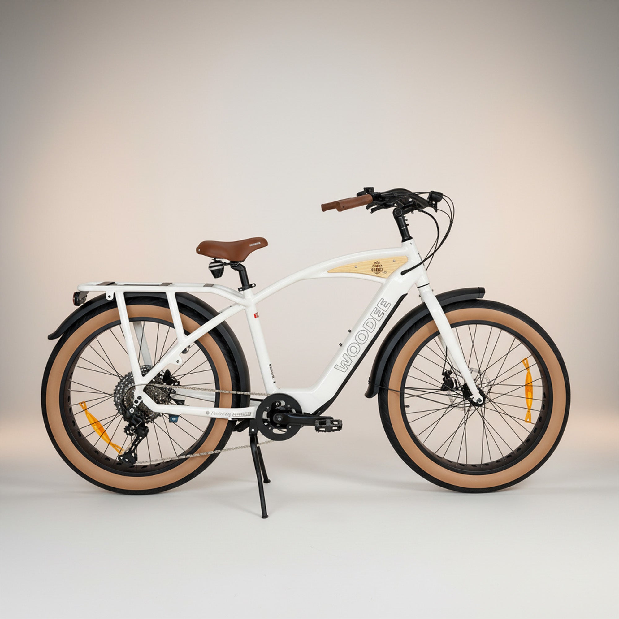 L’identité visuelle du Beach Cab 26 est renforcée par la présence de la plaque en bois signature Woodee, intégrée au cadre, qui constitue un élément distinctif fort sur le marché du vélo électrique. Ce choix de matériau et de finition s’inscrit dans une logique à la fois esthétique et durable, en lien avec l’univers surf et lifestyle de la marque, tout en assurant une cohérence globale du design.